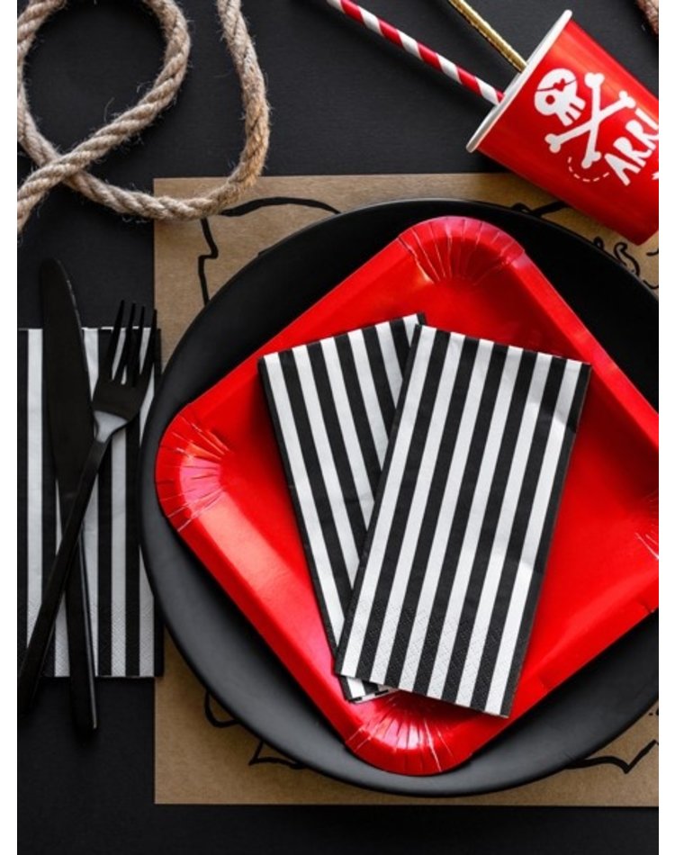 Schwarz und Weiß sind die Farben der Piratenflagge, des Jolly Rogers. Die Servierten erinnern so an die gute, alte Piratentradition, kurz vor dem Angriff eine schwarz-weiße Totenkopfflagge zu hissen. Gestalten Sie ihren kleinen Gästen mit diesen Servierten die Piratenparty stilecht, kühn und abenteuerlich.