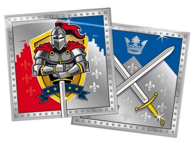 Diese Ritter-Servietten sorgen für die richtige Deko bei jeder Ritterparty. Die 20 bunten Party-Servietten (33 x 33 cm) sind beidseitig bedruckt und in den Farben Blau, Rot, Silber und Weiß gehalten. Auf der Rückseite sind zwei gekreuzte Schwerter und eine Krone zu sehen, auf der Vorderseite sieht man einen gefährlichen Ritter, der ein Schwert vor dem Körper in beiden Händen hält. Wichtiger Hinweis: Zu diesem Artikel passende Produkte finden Sie in unserem Shop!