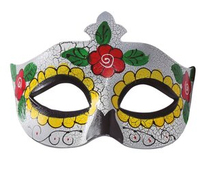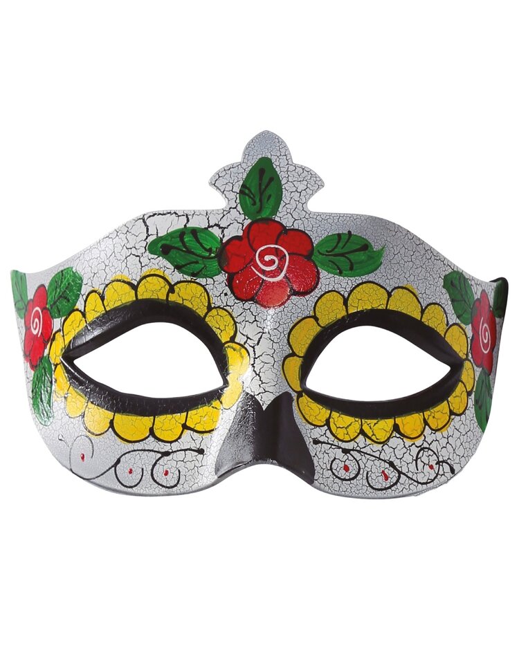 Bei dieser Maske werden alle ein zweites Mal hinsehen. Sie ist auf den ersten Blick bunt und fröhlich. Auf den zweiten Blick erkennt man aber, dass es sich um eine Grusel-Maske mit weit aufgerissenen Augen im Skelett-Stil handelt. Die Augen werden durch gelbe Blütenblätter umrandet, auf der Oberseite sind drei rote Blumen zu sehen, auch die Nase hat die Form einer schwarzen Blume. Eine tolle Maske in Klasse-Design und eine gute Alternative zur aufwändigen Schminke.