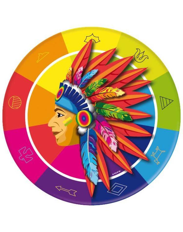 Servieren Sie Ihren Kuchen und Ihre Leckereien auf diesen farbenfrohen Tellern mit Indianermotiv. Ob zur Halloweenparty oder zur Mottofeier, die bunten Teller im Indianerdesign sind immer ein Hingucker. Der Indianerhäuptling thront vor einem bunten Hintergrund mit verschiedenen, indianischen Symbolen.