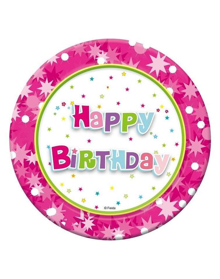 „Happy Birthday“ strahlt es Ihnen in bunten Buchstaben von den knallig rosafarbenen Partytellern entgegen. Im gleichen Design wie Pappbecher und Partyhüte sind die Teller nicht nur mit dem „Happy Birthday“ Motiv, sondern auch mit großen und kleinen, bunten Sternen versehen. Durch dazu passende, gleich bedruckte Becher und Hüte entsteht eine stimmige, fröhliche Geburtstagsdekoration.