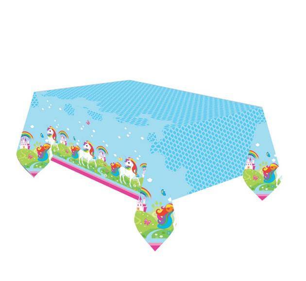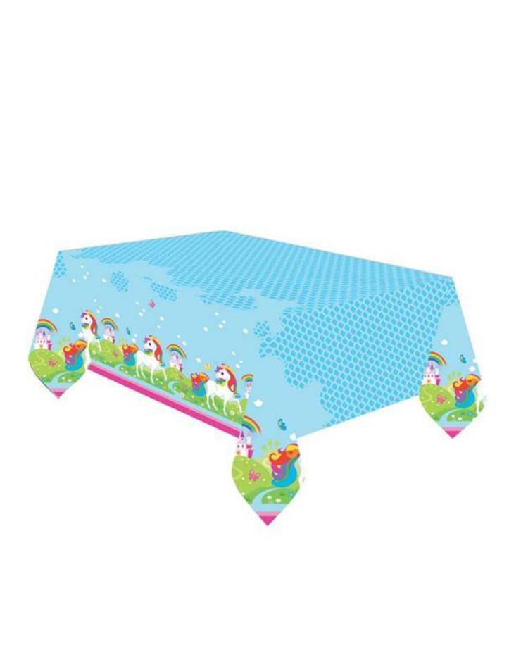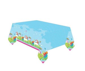 Lassen Sie sich von einem Einhorn in sein Regenbogenschloss entführen und verwandeln Sie Ihre Kuchentafel in eine magische Märchenlandschaft. Die Tischdecke mit dem Maß 183 x 138 cm ist auch für große Tische bestens geeignet. Der blaue Grund passt perfekt zu Partytellern, Wimpelketten und Folienballons im Einhorn-Look. Servieren Sie Kuchen und Getränke auf der märchenhaften Landschaft dieser Einhorn-Tischdecke.