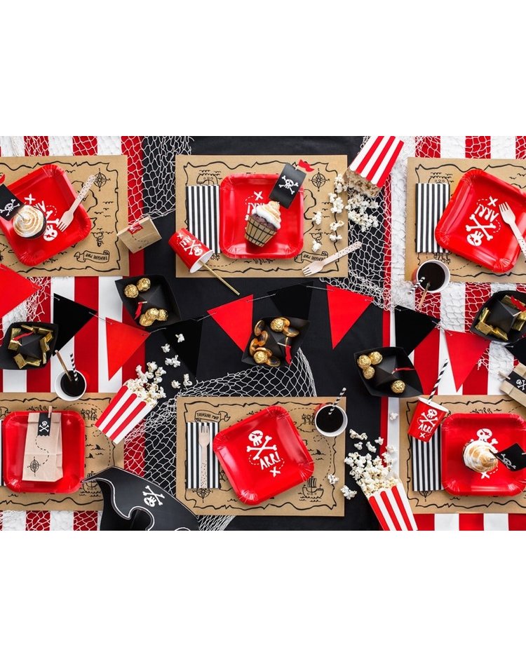 Tipp: Um die verwegene und abenteuerliche Stimmung eines Piratenunterschlupfes nachzustellen, können Sie dieses Produkt optimal mit Pompons, Wabenbällen und Papierfächern in Rot und Schwarz und goldenen Akzenten kombinieren. Zudem harmonieren sie hervorragend mit unseren roten Piraten Geschirr-Sets und Piraten Tortendekos.