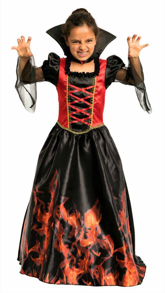 Dieses schicke Vampirkostüm für Mädchen kann dank dem glänzenden Flammen-Design auch als Teufel-Königin getragen werden.