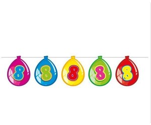 Auf 1,5 Metern Länge verkündet die Wimpelgirlande zum achten Geburtstag frohe Glückwünsche! Ob auf dem Tisch oder an der Wand, die bunten Luftballons sorgen für stimmungsvolle und kindgerechte Dekoration.