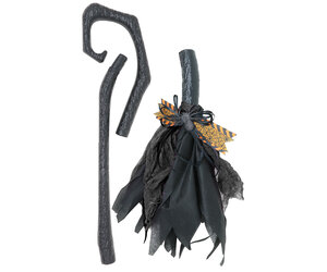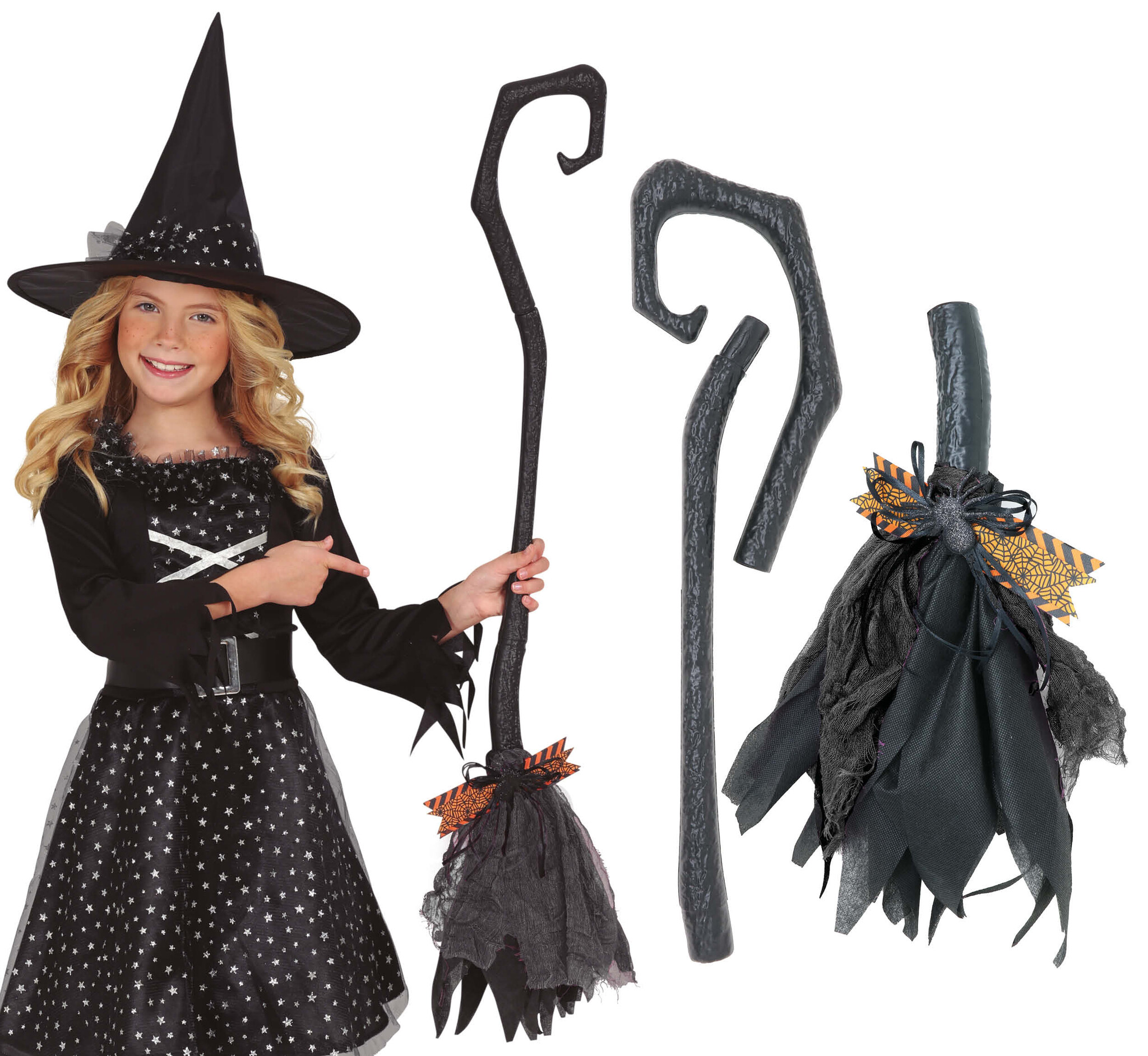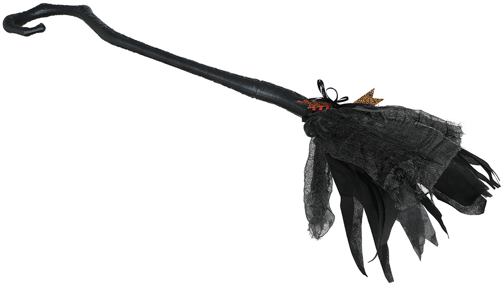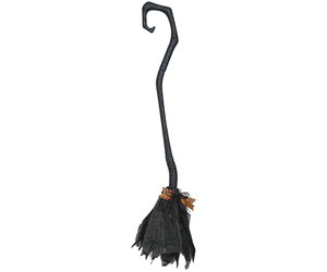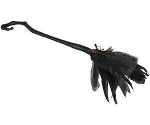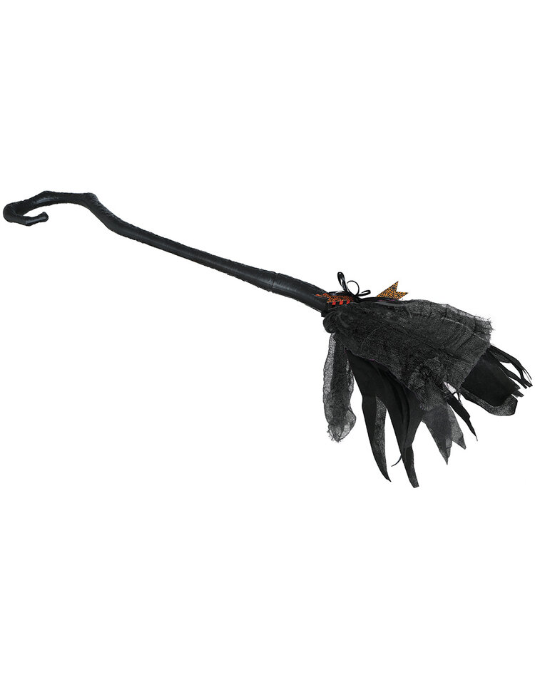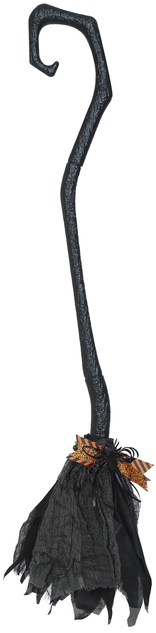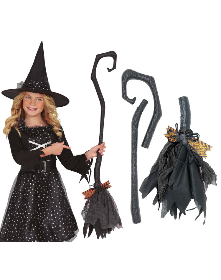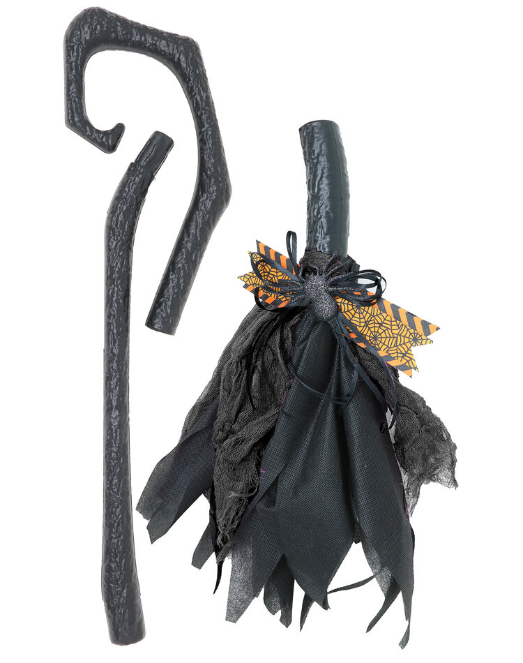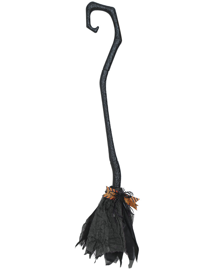 Der Besenstab in schwarzer Holz-Optik ist leicht geschwungen und lässt sich in drei Teile zerlegen. Der Besen ist einfach zusammenzustecken und ideal für den Transport und zum Aufbewahren. Der Besenkopf ist mit schwarzem Stoff und Netzmaterial verziert und trägt eine orange-schwarz gemusterte Halloween-Schleife. Den Besenkopf kann man nach Belieben in Form zupfen, damit er besonders wild aussieht.
